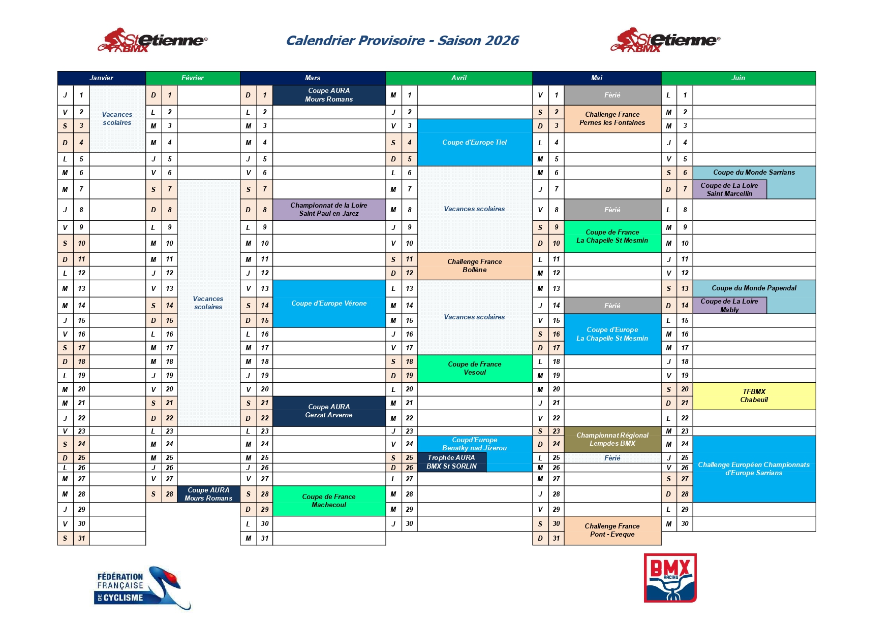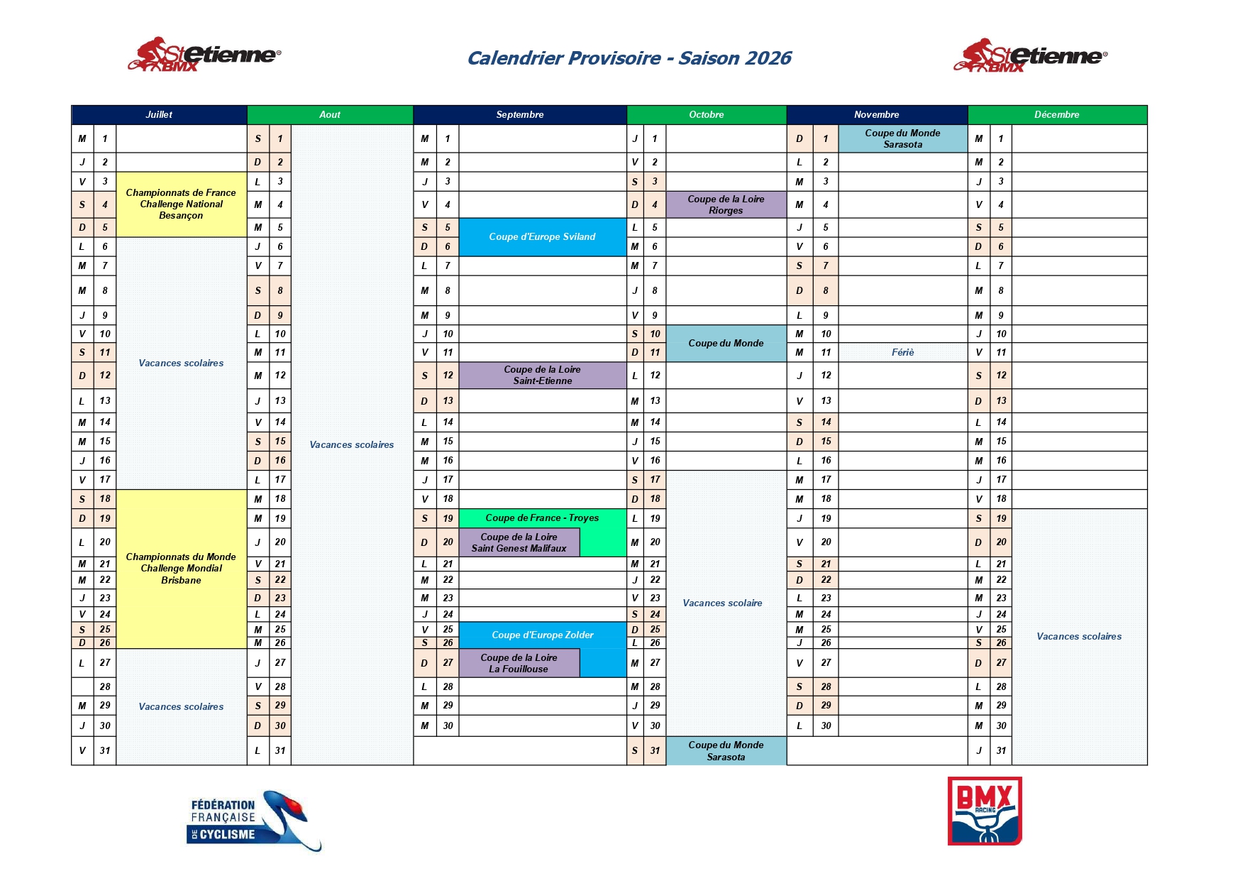 Calendrier Provisoire 2026
